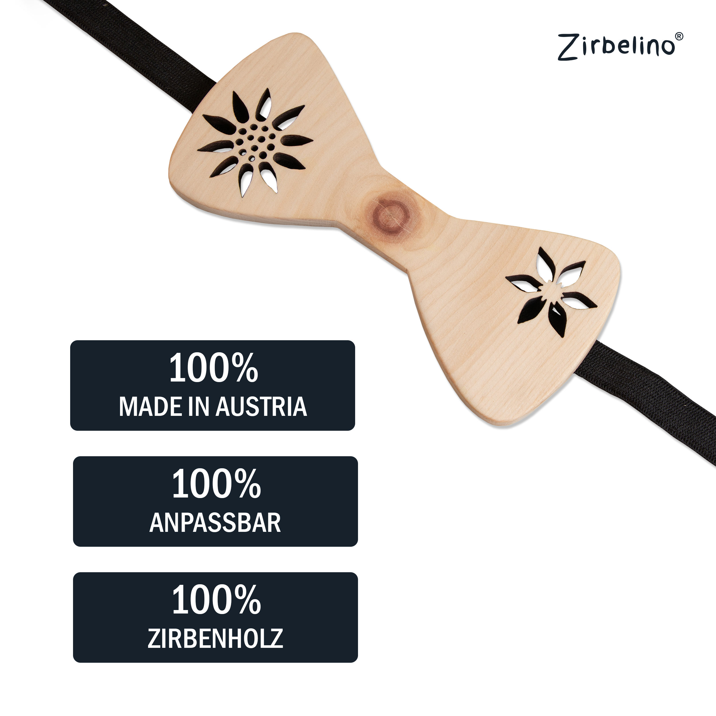 Holzfliegen aus Zirbenholz mit gelaserten Motiven und flexiblem Band – einzigartig im Look, vielseitig kombinierbar.